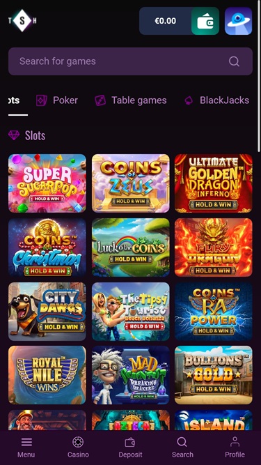 يستقبلك الموقع الإلكتروني مباشرةً بواجهة عصرية تُسهّل عليك التنقل بين جميع أقسام الكازينو المهمة. يُخصّص الجانب الأيسر من الشاشة لقائمة ستجد فيها رصيدك الحقيقي، ورصيد المكافآت، ونقاط الولاء، ومستواك.