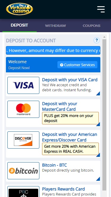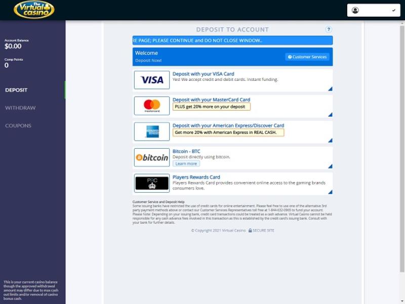 يتم تشغيل الكازينو الافتراضي بواسطة Real Time Gaming and Spinlogic Gaming ، والذي يسمح لك بالوصول إلى الكازينو من خلال برنامج قابل للتنزيل بالإضافة إلى منصة تعتمد على الويب.خيارات الخدمات المصرفية في The Virtual Casino