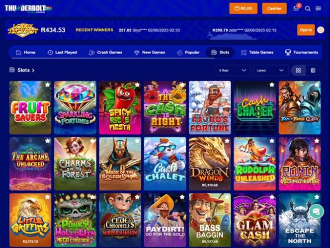 يُقدّم كازينو ثندربولت عشرات من ألعاب الفيديو سلوتس، بالإضافة إلى مجموعة صغيرة من ألعاب السلوتس الكلاسيكية. كما يُمكن للاعبين تجربة حظهم بالفوز بجوائز كبرى تراكمية كبيرة في ألعاب مُختارة.