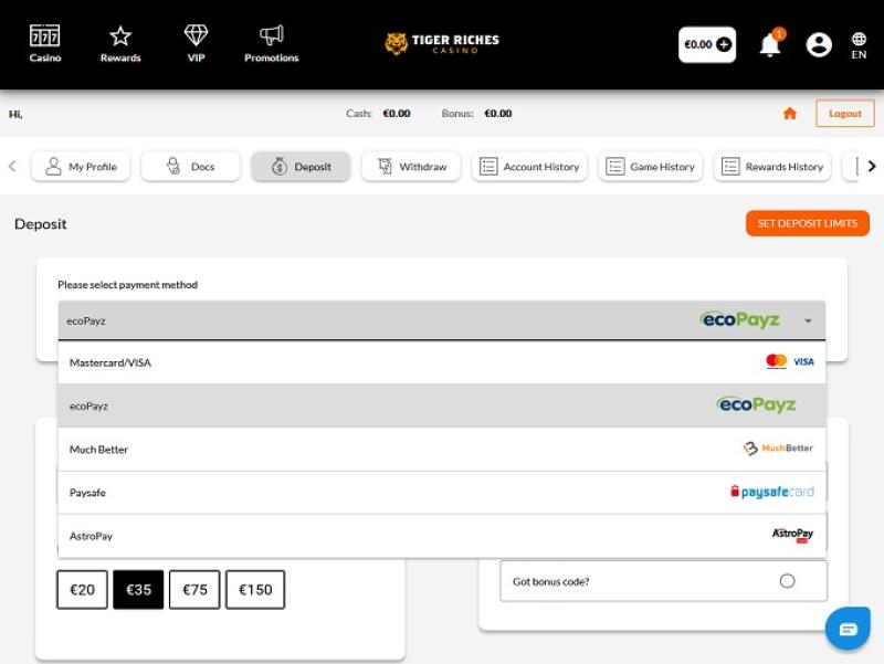 خيارات الخدمات المصرفية في TigerRiches Casino