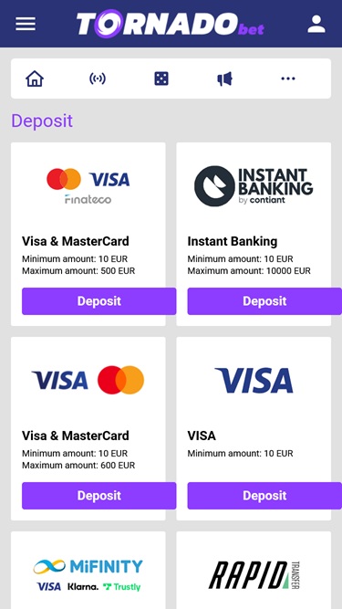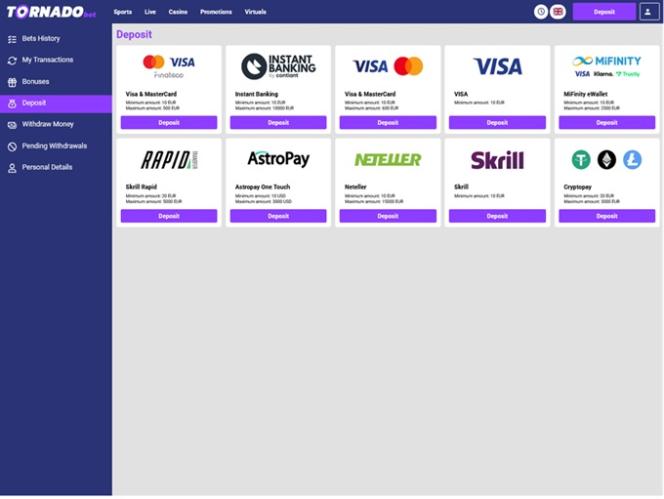 ستجد أدناه مجموعة مختارة من طرق الإيداع والسحب التي يقدمها كازينو TornadoBet: