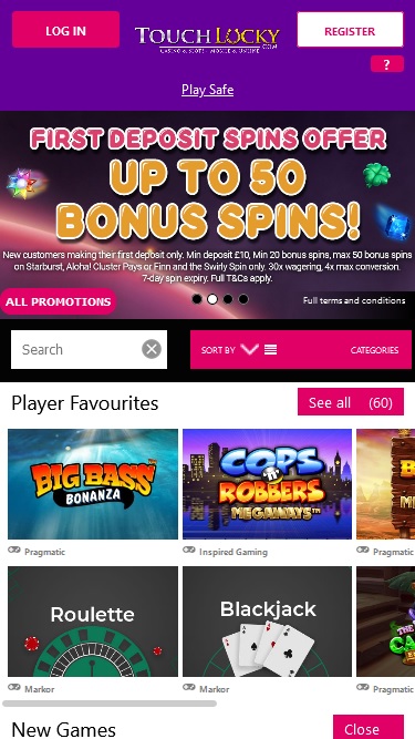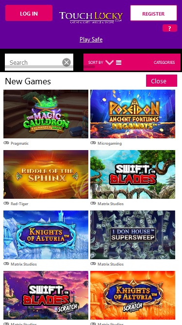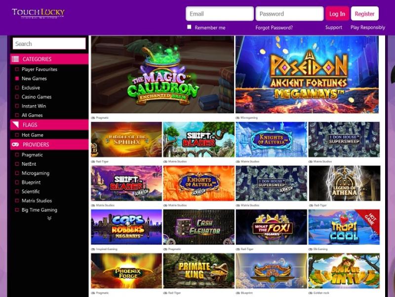 يتم تشغيل كازينو Touch Lucky بواسطة Microgaming, Net Entertainment, Big Time Gaming, ELK Studios, Evolution Gaming, EYECON, lightningboxgames, Yggdrasil, Realistic Games, Pragmatic Play, Red Tiger Gaming, IGT, Games Global, Blueprint Gaming, Merkur Gaming, Nektan, NextGen, NYX Interactive, Inspired Gaming, Scientific Games, Iron Dog Studio, Foxium, The Games Company and Rocksalt Interactive ، ويتم تقديم ألعابه من خلال منصة اللعب الفوري التي يمكنك الوصول إليها مباشرة من خلال متصفح الويب الخاص بجهازك المحمول.