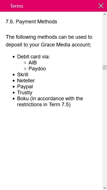 لا يقبل موقع Touch Lucky Casino اللاعبين من البلدان التالية: أفغانستان, ألاباما, جزر آلاند, ألاسكا, ألبانيا, ألبرتا, ألديرني, الجزائر, ساموا الأمريكية, أندورا, أنغولا, أنغيلا, القارة القطبية الجنوبية, أنتيغوا وباربودا, الأرجنتين, أريزونا, أركنساس, أرمينيا, أروبا, أستراليا, النمسا, أذربيجان, جزر البهاما, البحرين, بنغلاديش, بربادوس, بيلاروسيا, بلجيكا, بليز, بنين, برمودا, بوتان, بوليفيا, البوسنة والهرسك, بوتسوانا, جزيرة بوفيت, البرازيل, كولومبيا البريطانية, إقليم المحيط الهندي البريطاني, بروناي, بلغاريا, بوركينا فاسو, بوروندي, كاليفورنيا, كمبوديا, الكاميرون, كندا, الرأس الأخضر, جزر كايمان, جمهورية أفريقيا الوسطى, تشاد, تشيلي, الصين, جزيرة الكريسماس, جزر كوكوس (كيلينغ), كولومبيا, كولورادو, جزر القمر, الكونغو, جمهورية الكونغو الديمقراطية, كونيتيكت, جزر كوك, كوستاريكا, ساحل العاج, كرواتيا, كوبا, كوراساو, قبرص, الجمهورية التشيكية, دي سي, ديلاوير, الدنمارك, جيبوتي, دومينيكا, جمهورية الدومينيكان, الإكوادور, مصر, السلفادور, غينيا الاستوائية, إريتريا, إستونيا, أثيوبيا, جزر فوكلاند (مالفيناس), جزر فارو, فيجي, فنلندا, فلوريدا, فرنسا, غيانا الفرنسية, بولينيزيا الفرنسية, الأقاليم الجنوبية الفرنسية, الجابون, غامبيا, جورجيا, جورجيا, ألمانيا, غانا, جبل طارق, اليونان, جرينلاند, غرينادا, غوادلوب, غوام, غواتيمالا, غينيا, غينيا بيساو, غيانا, هايتي, هاواي, جزيرة هيرد وجزر ماكدونالد, هندوراس, هونغ كونغ, هنغاريا, أيسلندا, أيداهو, إلينوي, الهند, إنديانا, أندونيسيا, أيوا, إيران, العراق, أيرلندا, جزيرة مان, إسرائيل, إيطاليا, جامايكا, اليابان, جيرسي, الأردن, كانساس, كازاخستان, كنتاكي, كينيا, كيريباتي, كوريا، جمهورية كوريا الديمقراطية الشعبية, جمهورية كوريا, الكويت, قيرغيزستان, لاوس, لاتفيا, لبنان, ليسوتو, ليبيريا, ليبيا, ليختنشتاين, ليتوانيا, لويزيانا, لوكسمبورغ, ماكاو, مدغشقر, مين, ملاوي, ماليزيا, جزر المالديف, مالي, مالطا, مانيتوبا, جزر مارشال, مارتينيك, ماريلاند, ماساتشوستس, موريتانيا, موريشيوس, مايوت, المكسيك, ميشيغان, ميكرونيزيا، ولايات الاتحاد, مينيسوتا, ميسيسيبي, ميسوري, مولدوفا, موناكو, منغوليا, مونتانا, الجبل الأسود, مونتسيرات, المغرب, موزمبيق, ميانمار, ناميبيا, ناورو, نبراسكا, نيبال, هولندا, جزر الأنتيل الهولندية, نيفادا, نيو برونزويك, كاليدونيا الجديدة, نيو هامبشاير, نيوجيرسي, نيو مكسيكو, نيويورك, نيوزيلندا, نيوفاوندلاند ولابرادور, نيكاراغوا, النيجر, نيجيريا, نيوي, جزيرة نورفولك, كارولينا الشمالية, داكوتا الشمالية, مقدونيا الشمالية, جزر ماريانا الشمالية, الأقاليم الشمالية الغربية, النرويج, نوفا سكوشا, نونافوت, أوهايو, أوكلاهوما, عُمان, أونتاريو, أوريغون, باكستان, قصر, فلسطين, بنما, بابوا غينيا الجديدة, باراغواي, بنسلفانيا, بيرو, فيلبيني, بيتكيرن, بولندا, البرتغال, جزيرة الأمير إدوارد, بورتوريكو, قطر, كيبيك, جمع شمل, رود آيلاند, رومانيا, روسيا, رواندا, سانت هيلينا, سانت كيتس ونيفيس, سانت لوسيا, سانت مارتن, سان بيير وميكلون, سانت فنسنت وجزر غرينادين, ساموا, سان مارينو, ساو تومي وبرينسيبي, ساسكاتشوان, المملكة العربية السعودية, السنغال, صربيا, سيشل, سيراليون, سنغافورة, سلوفاكيا, سلوفينيا, جزر سليمان, الصومال, جنوب أفريقيا, كارولينا الجنوبية, داكوتا الجنوبية, جورجيا الجنوبية وجزر ساندويتش الجنوبية, جنوب السودان, إسبانيا, سريلانكا, السودان, سورينام, سفالبارد ويان ماين, سوازيلاند, السويد, سويسرا, سوريا, تايوان, طاجيكستان, تنزانيا, تينيسي, تكساس, تايلاند, تيمور الشرقية, توغو, توكيلاو, وصل, ترينيداد وتوباغو, تونس, ديك رومى, تركمانستان, جزر تركس وكايكوس, توفالو, أوغندا, أوكرانيا, الإمارات العربية المتحدة, الولايات المتحدة, جزر الولايات المتحدة الصغيرة النائية, أوروغواي, يوتا, أوزبكستان, فانواتو, الفاتيكان, فنزويلا, فيرمونت, فيتنام, جزر