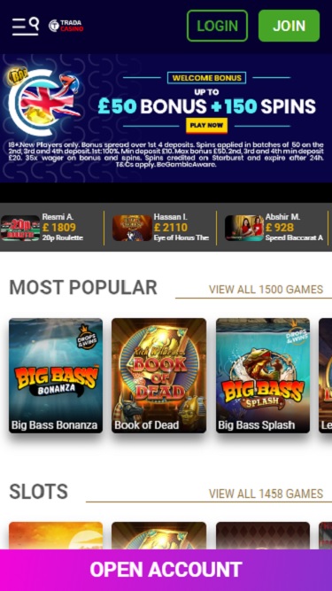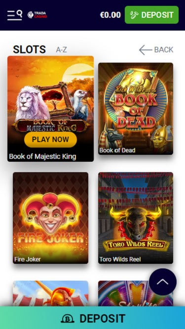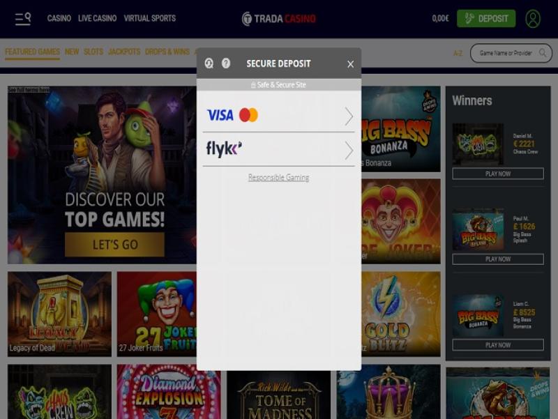 كازينو ترادا مدعوم من Microgaming, Net Entertainment, BetSoft, 1x2gaming, Amatic Industries, Barcrest, Big Time Gaming, Evolution Gaming, EYECON, Ezugi, iSoftBet, lightningboxgames, Oryx, Play'n GO, playson, Quickspin, Rabcat, Yggdrasil, Wazdan, Realistic Games, Booming Games, Stakelogic, Pragmatic Play, GAMING1, Red Tiger Gaming, Spinomenal, Red Rake Gaming, Skillzzgaming, SYNOT Games, Skywind, Triple Edge Studios, Stormcraft Studios, Switch Studios, All41 Studios, Gluck Games, Gameburger Studios, Neon Valley Studios, SpinPlay Games, Real Dealer Studios, GONG Gaming, Buck Stakes Entertainment, Games Global, Wizard Games, 2by2 Gaming, Ainsworth, Blueprint Gaming, NextGen, Pariplay, Tom Horn Gaming, WMS, Inspired Gaming, SG Interactive, Gamomat, Red7Mobile, Scientific Games, Reel Time Gaming, Authentic Gaming, betiXon, Bally Wulff, Betdigital, Just For The Win, Wild Streak Gaming, Slingshot Studios, Fortune Factory Studios, RubyPlay, 4ThePlayer, Gamevy, Crazy Tooth Studio, ReelPlay, Alchemy Gaming, Snowborn Games, Hacksaw Gaming, Bang Bang Games, Slotmill, Lucksome Gaming and Area Vegas ، وتُقدم ألعاب الكازينو عبر منصة لعب فوري عبر الإنترنت، تُتيح لك الوصول إلى جميع خدمات الكازينو عبر متصفح الإنترنت. كما يدعم اللعب عبر الهواتف المحمولة، مما يتيح للاعبين فرصة اللعب عبر هواتفهم الذكية أو أجهزتهم اللوحية.