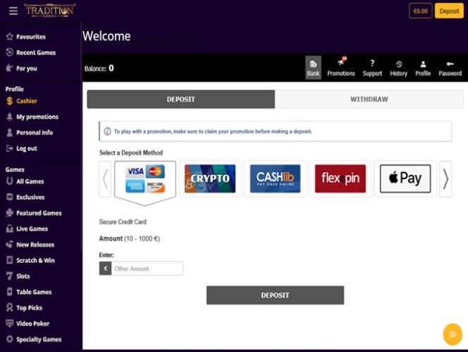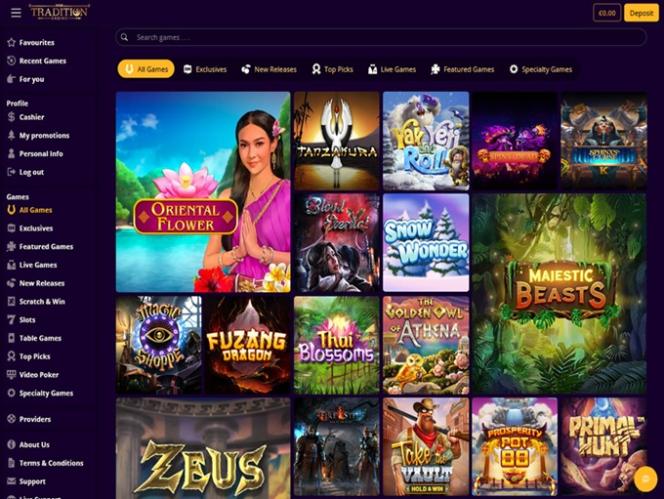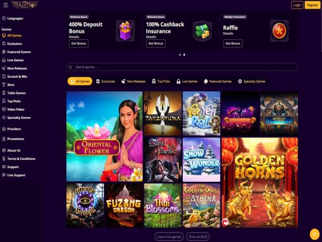 يعمل كازينو تراديشن بواسطة BetSoft, Genesis Gaming, Rival, Saucify, Vivo Gaming, Spinomenal, Felix Gaming, Fugaso, Radi8 Games, Fresh Deck Studios, Woohoo Games, Qora Games, SmartSoft Gaming, Tom Horn Gaming, Genii, Wager Gaming, Dragon Gaming and Dragoon Soft ، ويتوفر برنامج الكازينو إما عبر برنامج قابل للتنزيل أو عبر منصة لعب فوري عبر الإنترنت، وكلاهما يعملان بنفس الأداء. لا يدعم الكازينو حاليًا اللعب عبر الهاتف المحمول.ألعاب أخرى