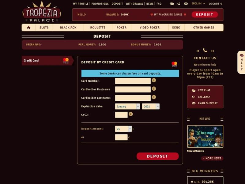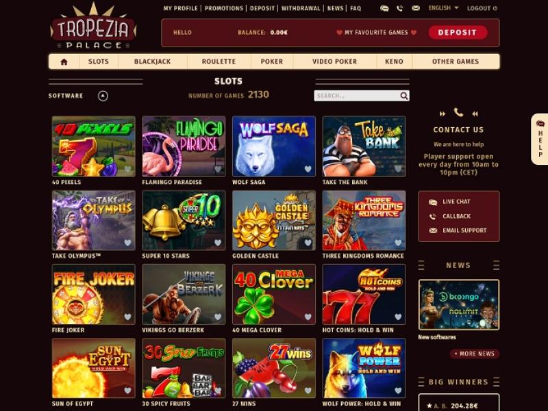 يعمل كازينو تروبيزيا بالاس بواسطة Net Entertainment, Playtech, BetSoft, Amatic Industries, Big Time Gaming, ELK Studios, Evolution Gaming, EYECON, Play'n GO, playson, Quickspin, Relax Gaming, Yggdrasil, Wazdan, Booming Games, Stakelogic, Pragmatic Play, Nolimit City, Red Tiger Gaming, Booongo, Spinomenal, Felix Gaming, Red Rake Gaming, Fugaso, Fantasma Games, Kalamba, Skywind, Pocket Games Soft, Bulletproof Games, Gluck Games, TrueLab Games, Amusnet Interactive, Ash Gaming, Push Gaming, Noble Gaming, Reflex Gaming, Wild Streak Gaming, Jade Rabbit Gaming, RubyPlay, 4ThePlayer, AvatarUX, Gamevy, High 5 Games, ReelPlay, Rarestone Gaming, BB Games, Boomerang Studios, Hacksaw Gaming, Max Win Gaming, Bang Bang Games and Peter And Sons ، الذي يوفر مئات الألعاب للاعبين عبر منصته الإلكترونية. عملية التسجيل في الكازينو سريعة وفعّالة، ولا تستغرق سوى بضع دقائق من وقتك، كما أن تصفح الموقع سلس. يمكن للاعبين الباحثين عن لعبة محددة استخدام وظيفة البحث، والتي تعمل بكفاءة عند البحث عن لعبة طاولة أو ماكينات قمار.خيارات الخدمات المصرفية في Tropezia Palace