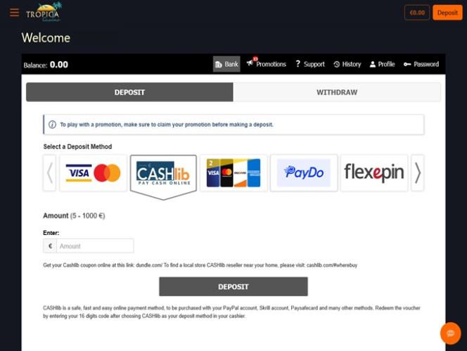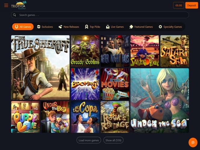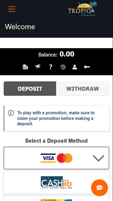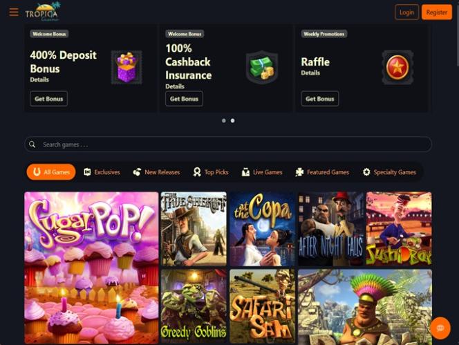 كازينو تروبيكا مدعوم من BetSoft, Genesis Gaming, Rival, Saucify, Vivo Gaming, Arrows Edge, Radi8 Games, Fresh Deck Studios, Woohoo Games, Qora Games, Genii and Dragon Gaming ، مما يمنحه مكتبة ألعاب ضخمة تتضمن ألعابًا ربما لم تسنح الفرصة للعديد من اللاعبين الأمريكيين لتجربتها. يتوفر الكازينو عبر برنامج قابل للتنزيل، بالإضافة إلى ميزة اللعب الفوري، التي تتيح لك اللعب مباشرةً عبر متصفح الويب.خيارات الخدمات المصرفية في Tropica Casino