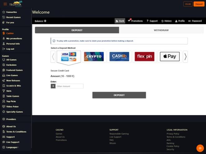 كازينو تروبيكا مدعوم من BetSoft, Genesis Gaming, Rival, Saucify, Vivo Gaming, Arrows Edge, Radi8 Games, Fresh Deck Studios, Woohoo Games, Qora Games, Genii and Dragon Gaming ، مما يمنحه مكتبة ألعاب ضخمة تتضمن ألعابًا ربما لم تسنح الفرصة للعديد من اللاعبين الأمريكيين لتجربتها. يتوفر الكازينو عبر برنامج قابل للتنزيل، بالإضافة إلى ميزة اللعب الفوري، التي تتيح لك اللعب مباشرةً عبر متصفح الويب.ألعاب أخرى