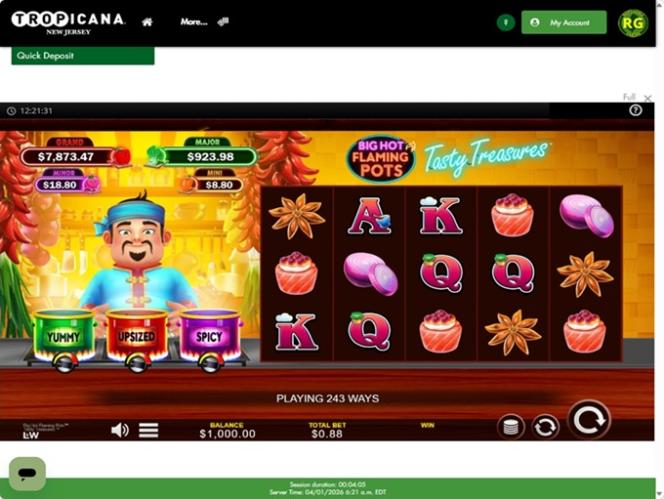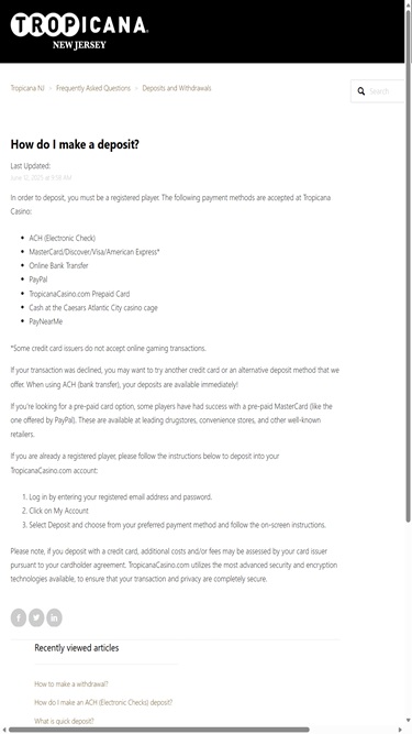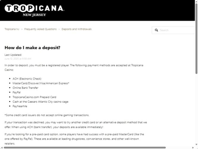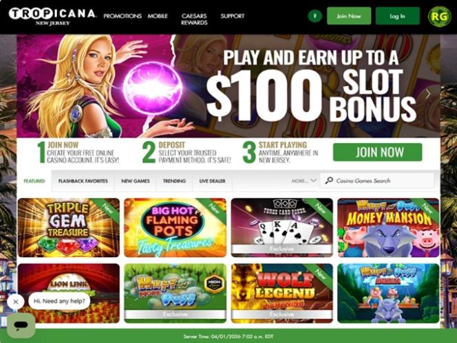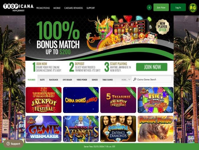 كازينو تروبيكانا هو كازينو يقع على ممشى خشبي، افتُتح عام ١٩٨١، ويُقدم تجربةً على طراز هافانا القديمة لعملائه. يضم الموقع أكثر من ٢٤٠٠ غرفة فندقية ومجمعًا ترفيهيًا متكاملًا، بالإضافة إلى الكازينو. بعد أن سمحت ولاية نيوجيرسي بالمراهنة عبر الإنترنت، يُقدم كازينو تروبيكانا منصته الخاصة للعملاء منذ ذلك الحين. للعب في كازينو تروبيكانا عبر الإنترنت، يجب أن يكون عمر اللاعبين ٢١ عامًا أو أكثر، وأن يكونوا متواجدين داخل حدود الولاية.معلومات الكازينو