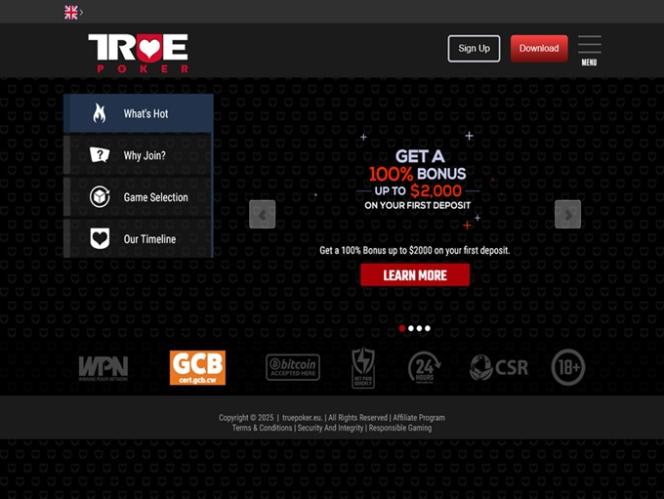 يُعدّ موقع True Poker من المواقع الرائدة في مجال البوكر الإلكتروني، حيث تأسس عام ٢٠٠١، ويحظى بشعبية كبيرة بين اللاعبين من الولايات المتحدة. ورغم بدايته القوية مع برنامجه الفريد ثلاثي الأبعاد للبوكر، إلا أن الأمور تطورت بشكل ملحوظ. واليوم، أصبح الموقع جزءًا من شبكة Winning Poker Network (WPN) ، ما يعني أنك تلعب في واحدة من أكبر منظومات البوكر المتاحة.