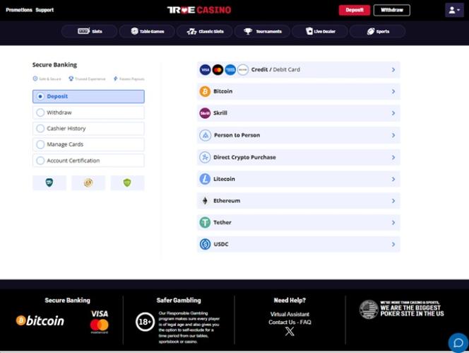 من الميزات الرائعة هنا إمكانية الإيداع باستخدام بيتكوين . تزداد شعبية مدفوعات العملات المشفرة، ومن الرائع انضمام True Poker، مما يجعل المعاملات أسرع وأكثر سرية. إذا لم تكن العملات المشفرة من اهتماماتك، فلا يزال الموقع يوفر خيارات تقليدية مثل بطاقات الائتمان، مما يتيح لك خيارات متعددة.
