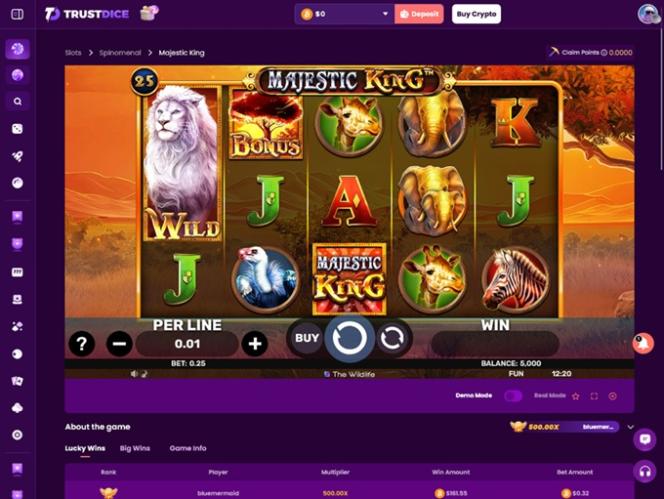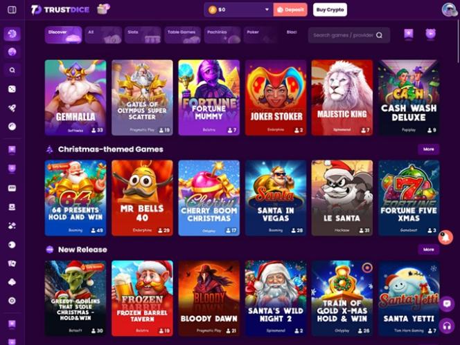 يضم موقع TrustDice مكتبة ألعاب سلوتس جيدة جدًا، حيث يضم الموقع أكثر من 900 لعبة مختلفة. هناك ألعاب من شركات مثل Wazdan وBetsoft وEndorphina وغيرها. تتوفر مجموعة متنوعة من الجوائز الكبرى التراكمية، ويمكن لعب معظم ألعاب السلوتس على أجهزتك المحمولة إذا رغبت في ذلك.