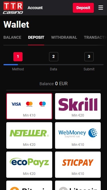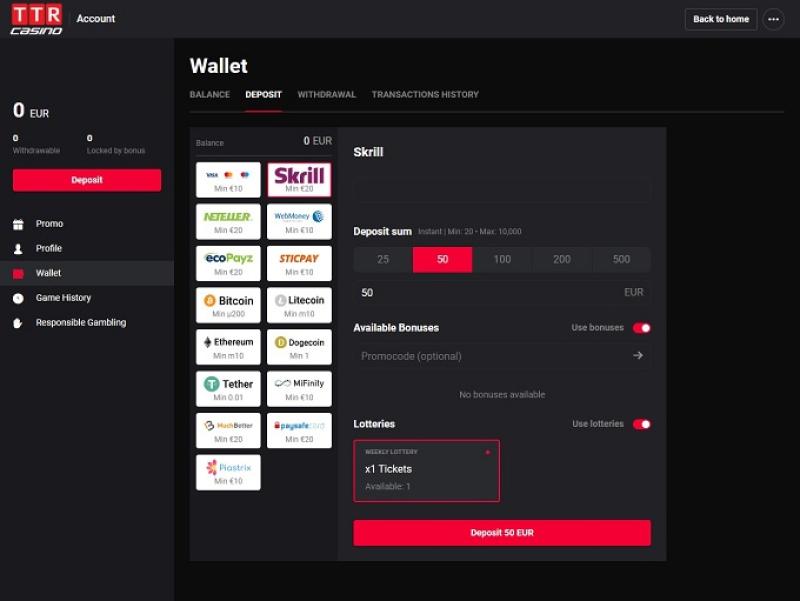 عند الاطلاع على الشروط والأحكام في كازينو TTR، لم أجد أي شيء غير مألوف. يتميز كازينو TTR بالنظام المصرفي الممتاز، حيث تتم عمليات الإيداع والسحب بشكل فوري تقريبًا عند استخدام بيتكوين. كما يدعم SOFORT وVisa وSkrill وNeteller عمليات الإيداع والسحب، ويمكن أيضًا الإيداع عبر MasterCard وPaysafecard. كما يمكن إجراء عمليات السحب عبر التحويل البنكي.خيارات الخدمات المصرفية في TTR Casino