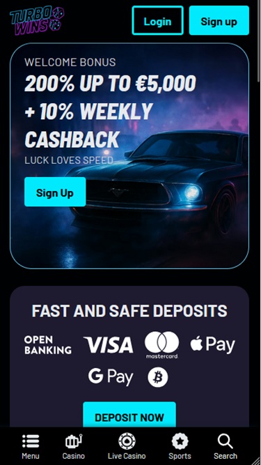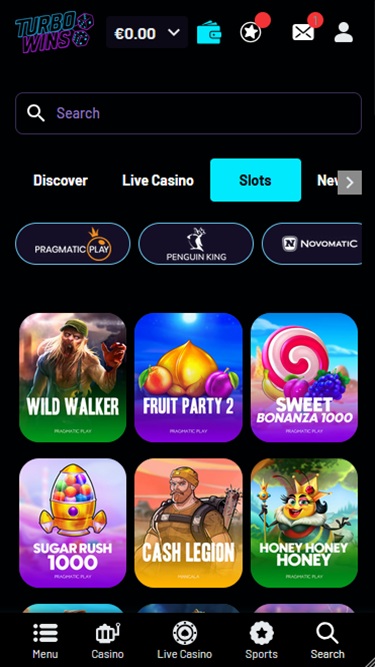 يوجد قسمان رئيسيان: الكازينو والكازينو المباشر، بالإضافة إلى قسم الرياضة لمن يرغبون في استكشاف خيارات المراهنة . سواءً استخدمتَ جهاز الكمبيوتر المكتبي أو أي جهاز محمول للوصول إلى Turbo Wins، ستحصل على نتائج ممتازة، إذ صُمم هذا الكازينو خصيصًا للشاشات الكبيرة والصغيرة.