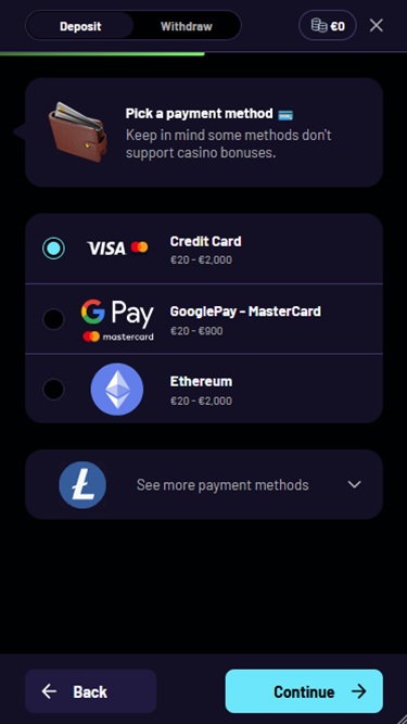 كما ذكرنا سابقًا، يعد هذا كازينو عبر الإنترنت صديقًا للعملات المشفرة، مما يعني أنه يمكنك هنا إجراء المدفوعات باستخدام خيارات الدفع الشائعة بالعملات المشفرة، ولكن يمكنك الاعتماد على بعض الخيارات التقليدية أيضًا، مثل التحويل البنكي، وGoogle Pay، وRevolut، وInterac، وبطاقات الائتمان والخصم الشائعة.