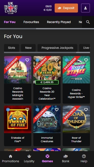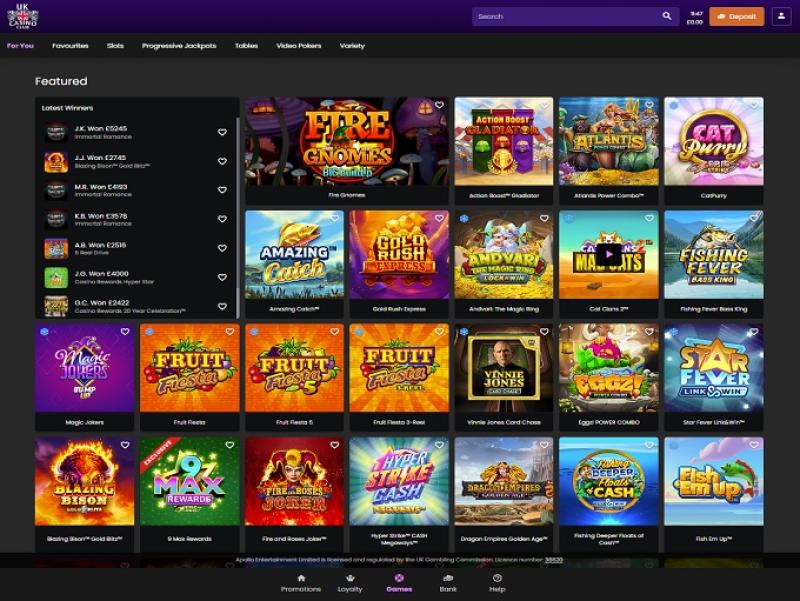 بالإضافة إلى ألعاب الكازينو التقليدية، يقدم نادي كازينو المملكة المتحدة مجموعة واسعة من ماكينات القمار. هناك مئات الألعاب المتاحة للعب هنا، بجودة تتراوح بين دون المستوى في بعض الألعاب القديمة وأخرى عالية الجودة في الألعاب الحديثة ذات الرسومات الرائعة. كما تتوفر العديد من الجوائز الكبرى التراكمية للفوز بها، حيث تتجاوز جوائز مثل جائزة Mega Moolah المليون دولار بانتظام.برنامج نقاط المنافسة