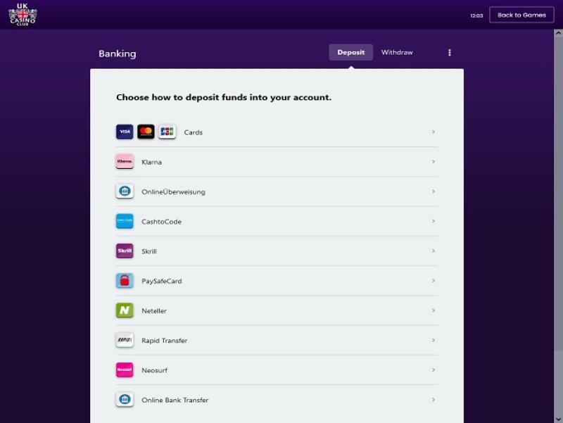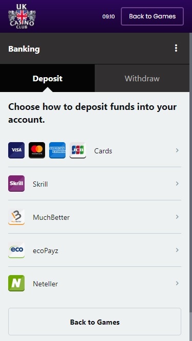 يعمل نادي كازينو المملكة المتحدة بواسطة Microgaming, Evolution Gaming, Rabcat, Triple Edge Studios, Northern Lights Gaming, Stormcraft Studios, All41 Studios, Gameburger Studios, Pulse 8 Studios, Neon Valley Studios, SpinPlay Games, GONG Gaming, On Air Entertainment, Buck Stakes Entertainment, Games Global, Old Skool Studios, Foxium, Just For The Win, PearFiction Studios, Slingshot Studios, Fortune Factory Studios, Crazy Tooth Studio, Alchemy Gaming, Snowborn Games, Gold Coin Studios, Half Pixel Studios, Eurostar Studios and Aurum Signature Studios ، الذي يوفر مئات الألعاب للاعبيه. يتم توفير برنامج الكازينو عبر منصة توصيل عبر الإنترنت، بالإضافة إلى برنامج عميل قابل للتنزيل، يسمح لك بتثبيت الكازينو مباشرةً على القرص الصلب. تجدر الإشارة إلى أنه لا يوجد فرق يُذكر في الأداء عند اختيار طريقة واحدة.خيارات الخدمات المصرفية في UK Casino Club