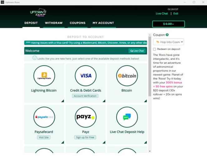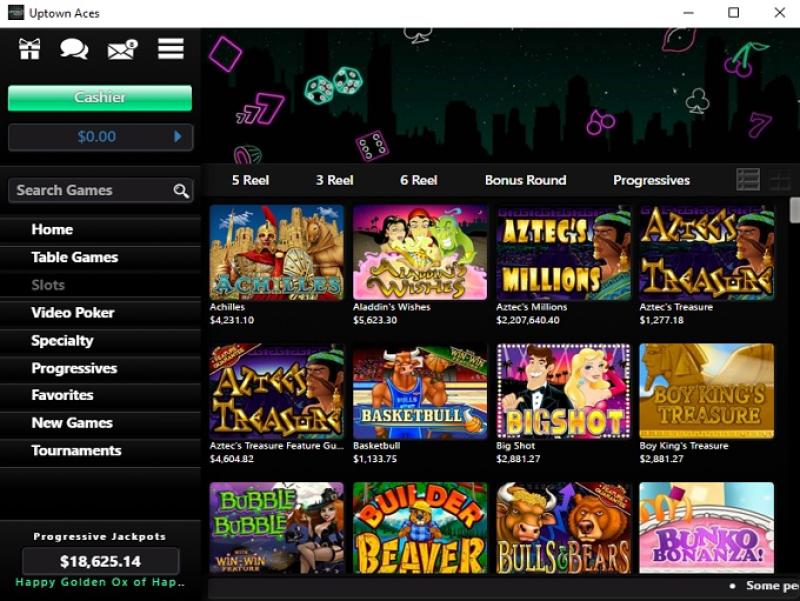 يعد Uptown Aces أحد الكازينوهات التابعة لشركة Deckmedia والمدعومة بواسطة Real Time Gaming ، والتي توفر اللعب الفوري والإصدارات القابلة للتنزيل من الكازينو.