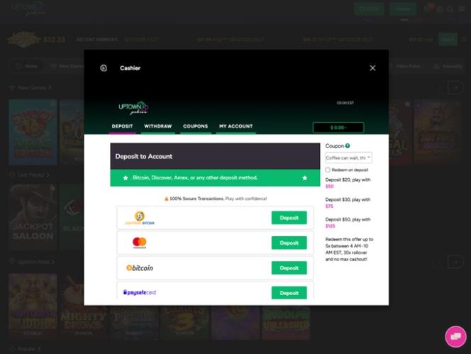 يتميز نظام الدفع في Uptown Pokies بتميزه، حيث يمكن للاعبين الإيداع والسحب عبر Visa وMasterCard وAmerican Express وSkrill وNeteller وPaysafecard وecoPayz وBitcoin وغيرها. مدة الانتظار في الكازينو تتراوح بين 48 و72 ساعة، ولكن يتم صرف الدفعات بعد ذلك بوقت قصير. حد السحب الأسبوعي منخفض، ولكن هذا يعود بشكل أساسي إلى محدودية السوق الأسترالية.
