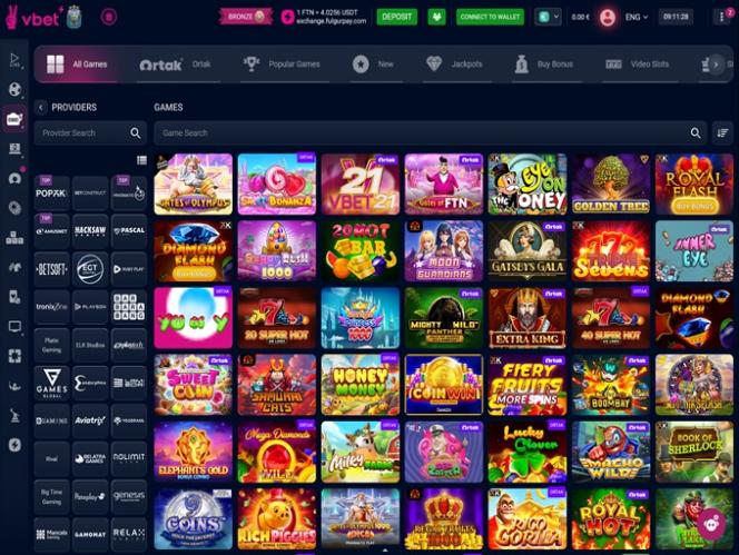 يتم تشغيل كازينو Vbet بواسطة Microgaming, Net Entertainment, Playtech, BetSoft, 1x2gaming, Amatic Industries, Big Time Gaming, ELK Studios, Espresso Games, Evolution Gaming, EYECON, Ezugi, Genesis Gaming, Habanero Systems, iSoftBet, Novomatic, Oryx, playson, Quickspin, Rabcat, Relax Gaming, Rival, Saucify, Thunderkick, Vivo Gaming, WM, Yggdrasil, Endorphina, Wazdan, Realistic Games, GameArt, Betgames, Booming Games, BetConstruct, Stakelogic, Pragmatic Play, Nolimit City, Felt Gaming, Red Tiger Gaming, ZEUS Services, Booongo, LuckyStreak, Spinomenal, Felix Gaming, Red Rake Gaming, Inbet Games, Skillzzgaming, Xprogaming, Fugaso, Belatra Games, Fantasma Games, SYNOT Games, Kalamba, Revolver Gaming, Spin Games, Platipus Gaming, Skywind, Spinmatic, Spadegaming, Triple Edge Studios, BGAMING, Northern Lights Gaming, Fazi, Evoplay, Stormcraft Studios, Switch Studios, SA Gaming, OneTouch, Electric Elephant Games, Pocket Games Soft, Dreamtech Gaming, Bulletproof Games, All41 Studios, Gluck Games, Mascot Gaming, TVBet, NetGame Entertainment, Gameburger Studios, Pulse 8 Studios, Slot Factory, Neon Valley Studios, DLV, FashionTV, Golden Rock Studios, Radi8 Games, Spearhead Studios, ThunderSpin, SpinPlay Games, Mancala Gaming, 7Mojos, SmartSoft Gaming, KA Gaming, Atmosfera, FilsGame, GONG Gaming, Blue Guru Games, Lady Luck Games, On Air Entertainment, Buck Stakes Entertainment, Caleta Gaming, Creedroomz, Eurasian Gaming, Games Global, Amusnet Interactive, Wizard Games, Ash Gaming, bluberi, Blueprint Gaming, CT Interactive, GamesOS, Greentube, omi-gaming, Pariplay, Tom Horn Gaming, Genii, Gamomat, PlatinGaming, RFranco Group, Wager Gaming, Reel Time Gaming, MGA, BF Games, Bally Wulff, Capecod Gaming, Iron Dog Studio, Old Skool Studios, Foxium, Zitro, Just For The Win, Reflex Gaming, Aspect Gaming, Storm Gaming Technology, PearFiction Studios, Apollo Games, Wild Streak Gaming, Slingshot Studios, Golden Hero, Fortune Factory Studios, Jade Rabbit Gaming, STHLM Gaming, RubyPlay, 4ThePlayer, AvatarUX, Gamevy, Crazy Tooth Studio, NetGaming, High 5 Games, Groove Gaming, ReelPlay, Japan Technicals Games, SlotVision, PlayStar, Alchemy Gaming, Rarestone Gaming, BB Games, Black Pudding Games, Snowborn Games, Boomerang Studios, Hacksaw Gaming, Max Win Gaming, Gold Coin Studios, Bang Bang Games, Gamzix, Half Pixel Studios, Arcadem, Slotmill, Triple Cherry, SilverBack Gaming, Dragon Gaming, Peter And Sons, Eurostar Studios, Aurum Signature Studios, Charismatic, Lotto Instant Win, Onlyplay, FastSpin, Armadillo Studios, Lucksome Gaming, Gamebeat, FlipLuck, Dragoon Soft, Urgent Games, Area Vegas, ELA Games, Leap Gaming, Betradar, PoggiPlay, GoldenRace, Aviatrix, AGT Software, Kiron, 3 Oaks Gaming, Amigo Gaming, Wishbone Games, LiveGames, Yeebet Gaming, PopOK Gaming, Spribe, Jili, Circular Arrow, Print Studios, 5Men Gaming, HammerTime Games, BetSolutions, Four Leaf Gaming, INO Games, Nailed It! Games, Atomic Slot Lab, Neko Games, Reel Kingdom, Oros Gaming, Givme Games, JVL, Indigo Magic, Live88, Bigpot Gaming, VoltEnt and PlayAce ، ويتم توفير ألعابه من خلال منصة تعتمد على الويب بالإضافة إلى موقع محمول يسمح للمقامرين باللعب أثناء التنقل.