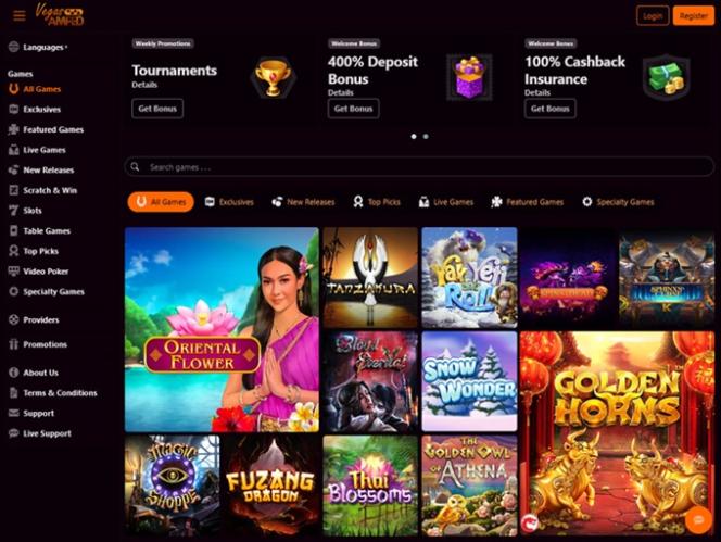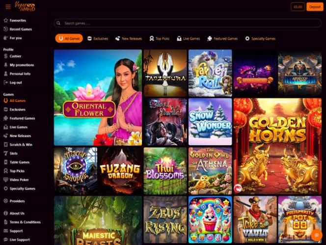 كازينو فيغاس أمبد يعمل بنظام BetSoft, Genesis Gaming, Rival, Saucify, Vivo Gaming, Spinomenal, Felix Gaming, Fugaso, Radi8 Games, Fresh Deck Studios, Woohoo Games, Qora Games, SmartSoft Gaming, Tom Horn Gaming, Genii, Wager Gaming, Dragon Gaming and Dragoon Soft ، وتُقدم ألعاب الكازينو عبر برنامج قابل للتنزيل، بالإضافة إلى منصة لعب فوري عبر الإنترنت. كما يدعم الكازينو اللعب عبر الهاتف المحمول، ما يتيح لك اللعب من أي مكان تتوفر فيه إشارة إنترنت.ألعاب أخرى