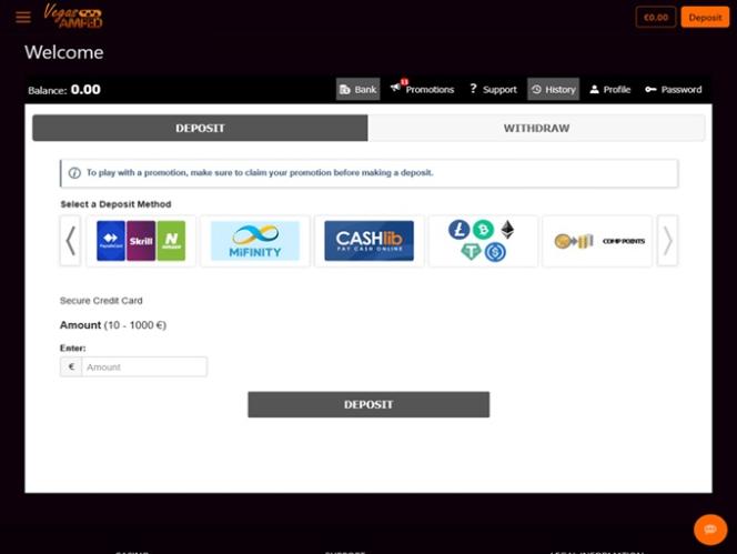 الشروط والأحكام في كازينو فيغاس أمبد قياسية إلى حد ما، ولكن نظرًا لطبيعة الكازينو السيئة، لا يمكن الوثوق به. النظام المصرفي في كازينو فيغاس أمبد ضعيف، حيث يُتيح الموقع عمليات الإيداع والسحب عبر Neteller وecoPayz وSkrill. كما يُمكن الإيداع عبر UseMyBank وVisa وMasterCard وPaysafecard وuPayCard. يُضعف النظام عدم صرف الأرباح في الوقت المحدد من قِبل الكازينو. كما أن حد السحب اليومي للمكاسب منخفض جدًا، وهو 2000 دولار أمريكي.خيارات الخدمات المصرفية في Vegas Amped