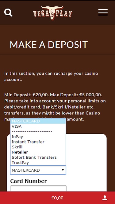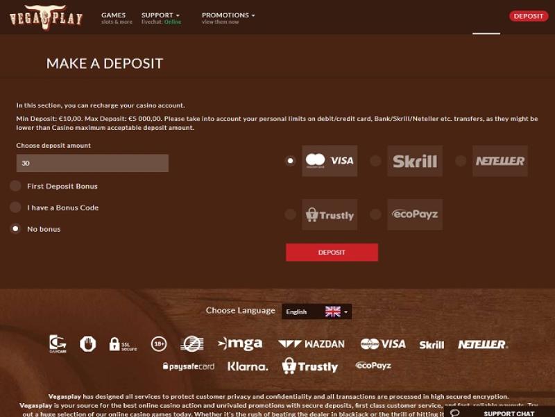 كازينو فيغاس بلاي يعمل بنظام Wazdan ، وتُقدم ألعابه عبر منصة لعب فوري. كما يدعم اللعب عبر الهاتف المحمول.خيارات الخدمات المصرفية في Vegas Play Casino