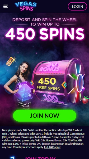 يحصل اللاعبون في كازينو فيغاس سبينز على فرص لتدوير عجلة فيغاس بناءً على مبلغ الرهان الذي يراهنون به. يحصل اللاعبون على دورة واحدة مقابل كل 500 جنيه إسترليني يراهنون بها، ويمكنهم الفوز بجائزة كبرى تصاعدية، وأرصدة، ودورات مجانية، ومكافآت أخرى من خلال هذه المكافأة.معلومات الترخيص