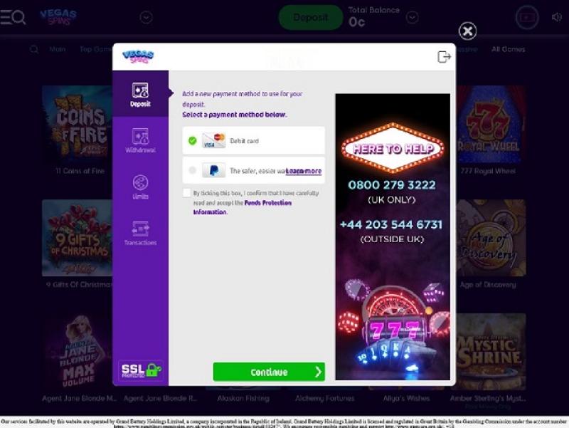 يُقدم الكازينو ألعابًا مسؤولة من خلال صفحة مخصصة على موقعه. سيجد اللاعبون في هذه الصفحة معلومات حول مكافحة إدمان القمار لدى القاصرين ومشاكل المقامرة، مع روابط لمنظمات خارجية يمكنها تقديم المساعدة إذا كنت أنت أو أي شخص تعرفه بحاجة إليها. كما يوفر الكازينو للاعبين إمكانية تحديد حدود الرهان أو استبعادهم من الموقع. فريق دعم الكازينو متاح على مدار الساعة، مع إمكانية الحصول على المساعدة عبر الدردشة المباشرة والهاتف والبريد الإلكتروني. فريق العمل هو نفسه الذي ستجده في كازينوهات كافاسا الأخرى. هذا يعني أنك ستحصل على استجابة سريعة وممثلين يمكنهم مساعدتك في الإجابة على أي أسئلة لديك. يقوم كازينو فيغاس سبينز بتشفير معلومات اللاعبين باستخدام تقنية تشفير SSL 128 بت، والتي تشفر معلوماتك الشخصية والمالية بحيث لا يمكن قراءتها إلا من قبل موظفي الكازينو. يمكن للاعبين الاطمئنان إلى أن هذا ينطبق على جميع جوانب الكازينو.الشروط والأحكام، الخدمات المصرفية