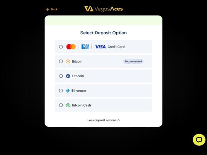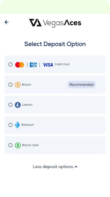يدعم كازينو VegasAces طريقتين للدفع: بطاقات الدفع الشائعة والمعاملات المصرفية بالعملات المشفرة. يمكن للاعبين الإيداع باستخدام بطاقات الخصم والائتمان ماستركارد وفيزا وأمريكان إكسبريس، وهي خيارات مناسبة للاعبين المقيمين في الولايات المتحدة. خيارات العملات المشفرة المتاحة لتمويل حساب الكازينو هي بيتكوين، وبيتكوين كاش، ولايتكوين، وإيثريوم .