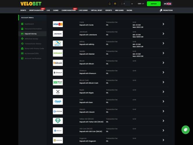 يمكن للاعبين الاعتماد على خيارات متنوعة واسعة الاستخدام للإيداع والسحب . يوفر أمين الصندوق محافظ إلكترونية شائعة، وبطاقات دفع، بالإضافة إلى طرق دفع بالعملات المشفرة ، بما في ذلك بيتكوين، وبيتكوين كاش، ولايتكوين، وإيثريوم، وغيرها.