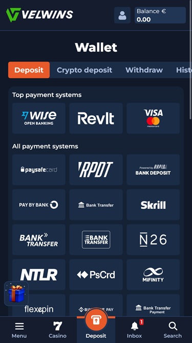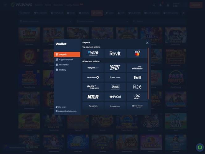 لإدارة أموالك في كازينو Velwins، يمكنك استخدام عدة طرق مصرفية، بما في ذلك خيارات شائعة مثل Visa وMastercard والتحويل المصرفي و Flexepin و Skrill و Neteller وMiFinity و Paysafecard . بالإضافة إلى ذلك، يمكن للاعبين استخدام العديد من العملات الرقمية كوسائل دفع معتمدة، بما في ذلك Bitcoin و Cardano وDogecoin و Ethereum و Litecoin و Solana و Tron و USD Coin وTether.