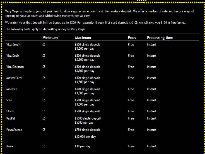 النظام المصرفي في كازينو فيري فيغاس للأجهزة المحمولة محدود بعض الشيء، ولكنه لا يزال مناسبًا لموقع مراهنات على الأجهزة المحمولة. تُقبل عمليات الإيداع والسحب عبر بطاقات Visa وMasterCard وPaysafecard وSolo وPayPal وMaestro، كما يُمكن السحب عبر التحويل البنكي. يوجد حد سحب يومي قدره 1000 جنيه إسترليني على عمليات السحب عبر PayPal، بينما يُسمح بخمس معاملات يوميًا ببطاقات الائتمان والخصم بقيمة 20,000 جنيه إسترليني لكل معاملة. تستغرق معالجة عمليات السحب من 3 إلى 5 أيام تقريبًا.خيارات الخدمات المصرفية في Very Vegas Mobile Casino