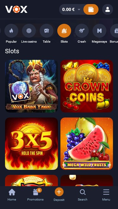 يضم كازينو VOX قسمًا منفصلاً بالكامل مخصصًا لألعاب الكراش الفورية، وهي إصدارات فريدة تركز على قواعد صارمة، وجولات سريعة، وإمكانية تحقيق أرباح عالية. يوجد هنا العديد من الخيارات الرائعة التي تستحق التجربة، وهذه بعض الخيارات المتاحة: بلينكو، بلينكو راش، جيت إكس، كراش إكس، سبيس إكس واي، سوبر بينغو، بينغو مانيا، وتشيكن رود.