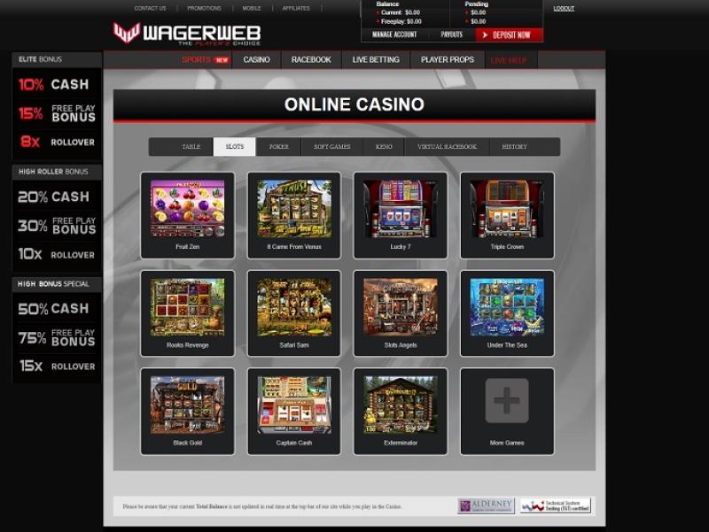 يضم WagerWeb عددًا لا بأس به من ألعاب السلوتس الكلاسيكية والفيديو، مع أن الكازينو يبدو أنه يقدم نفس الألعاب المخصصة للأمريكان والتي تتوفر في مواقع أفضل. كما يقدم عددًا من الجوائز الكبرى التراكمية، وسيجد اللاعبون أيضًا ألعاب سلوتس للهواتف المحمولة.