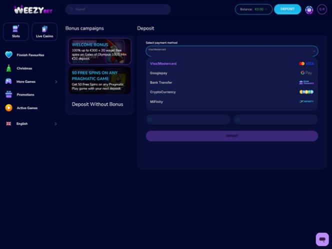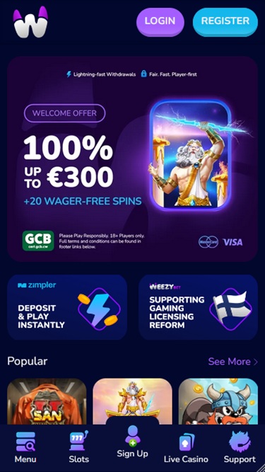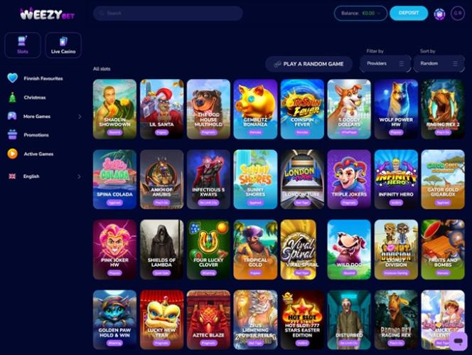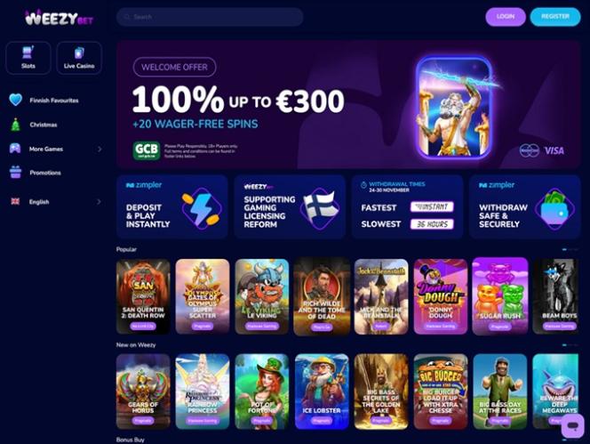 WeezyBet.com هو كازينو إلكتروني مُنظّم ومرخّص من قِبَل حكومة جزيرة أنجوان المُتمتّعة بالحكم الذاتي، اتحاد جزر القمر. يُركّز هذا المُشغّل على اللاعبين المُقيمين في فنلندا، والدنمارك، وألمانيا، وهولندا، وإيطاليا، واليونان، وكندا. مع ذلك، حتى لو كنتَ من مُنظّمي قمار آخرين، ابقَ مُتابعًا، فهذه العلامة التجارية تبدو جذابة للغاية للوهلة الأولى.
