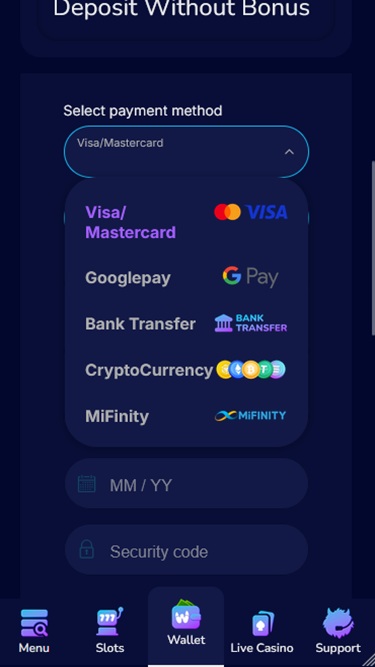 يضمن الكازينو للاعبين إمكانية الاختيار من بين خيارات دفع متنوعة وموثوقة ، بما في ذلك المحافظ الإلكترونية مثل Skrill ، وبطاقات الخصم والائتمان، وخيارات العملات المشفرة المتنوعة، بما في ذلك Bitcoin Cash، وBitcoin، وDogecoin، وEthereum، وLitecoin، وSolana، وTron، وTether، وRipple، والمزيد.