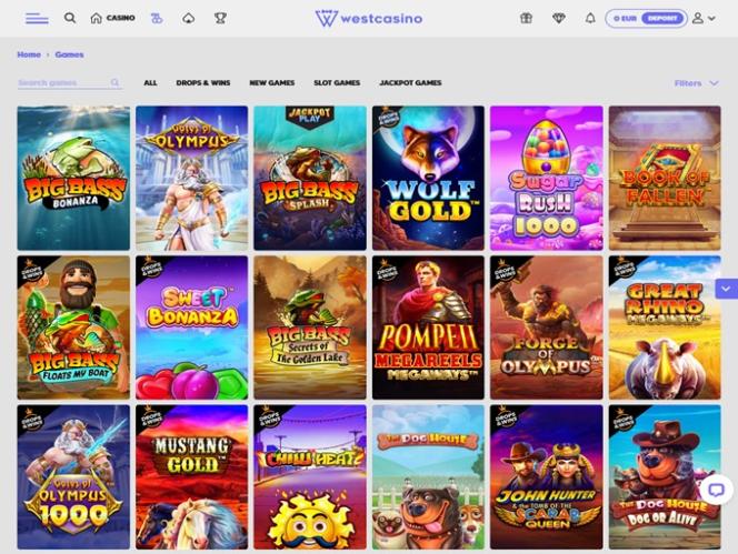 كازينو ويست يعمل بنظام Playtech, BetSoft, 1x2gaming, Amatic Industries, Ezugi, Habanero Systems, Play'n GO, playson, Quickspin, Thunderkick, Yggdrasil, Wazdan, Pragmatic Play, Nolimit City, Booongo, Spinomenal, FunFair, Kalamba, Platipus Gaming, Nucleus Gaming, Spadegaming, BGAMING, IGTech, Bulletproof Games, Gluck Games, Mascot Gaming, Spearhead Studios, Swintt, Mancala Gaming, SmartSoft Gaming, KA Gaming, Atmosfera, Lady Luck Games, Holle Games, mplay, Reevo, Ash Gaming, Blueprint Gaming, EveryMatrix, Igrosoft, Merkur Gaming, Mr Slotty, Reel Time Gaming, Iron Dog Studio, Reflex Gaming, Wild Streak Gaming, Jade Rabbit Gaming, AvatarUX, Gamevy, ReelPlay, Rarestone Gaming, Qtech Games, Black Pudding Games, Boomerang Studios, Bang Bang Games, Peter And Sons, Absolute Live Gaming, FastSpin, Armadillo Studios, Lucksome Gaming, Gamebeat, FlipLuck, Playgon, RAW iGaming, Kiron, 3 Oaks Gaming, Spribe, 5Men Gaming, Reel Kingdom, JVL, Spinza and Popiplay ، وتُقدم ألعاب الكازينو عبر منصة ويب جذابة تُحمّل عبر متصفح الإنترنت. الموقع سهل التصفح، كما أنه يدعم الهواتف المحمولة.المقامرة المسؤولة ودعم العملاء والأمان