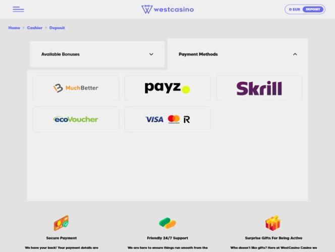 خيارات الخدمات المصرفية في WestCasino