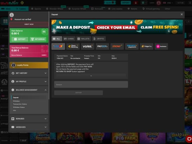 يمكن للاعبين اختيار الإيداع والسحب باستخدام طرق دفع متنوعة، مثل فيزا، وماستركارد ، ويونيون باي، وأدفكاش، وباير، وغيرها. كما يمكن لمن يرغبون في استخدام العملات المشفرة كوسيلة دفع أساسية القيام بذلك بسهولة.