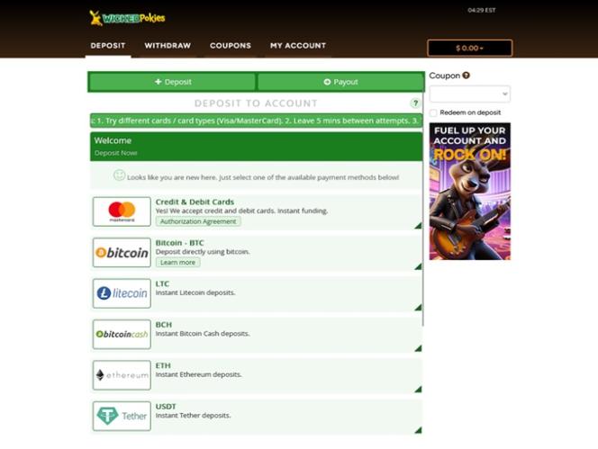 يقدم Wicked Pokies خيارات مصرفية موثوقة. سيتمكن اللاعبون من الاختيار بين الطرق التقليدية والحديثة. يدعم أمين الصندوق المعاملات بالدولار الأسترالي، وبيتكوين، وإيثريوم، ولايتكوين، وUSD Coin، وتيثر. يوفر الكازينو بطاقات الخصم والائتمان، بينما يمكن لعشاق العملات المشفرة إجراء الإيداع والسحب باستخدام العملات الرقمية الشائعة.