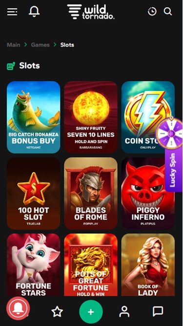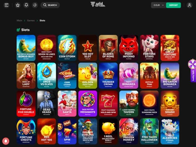 يقدم كازينو Wild Tornado تشكيلة واسعة من ألعاب السلوتس. يضم الكازينو ألعابًا من مطورين مثل Net Ent وNYX وSoftSwiss وPragmatic Play وEndorphina وغيرها. كما يقدم مجموعة من الجوائز الكبرى التراكمية، والتي تقدم جوائز نقدية كبيرة يمكن ربحها بلفّة واحدة للبكرات. كما يتوفر لعب السلوتس على الهواتف المحمولة.