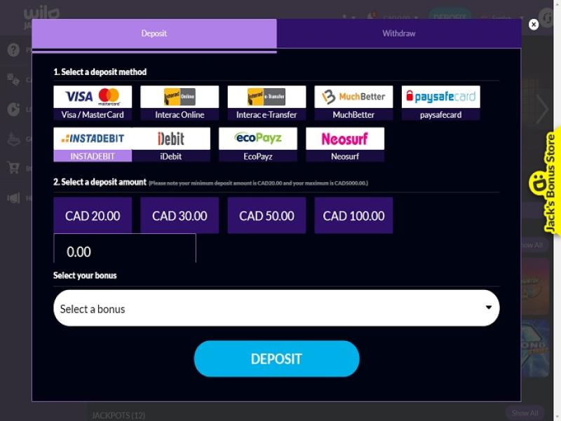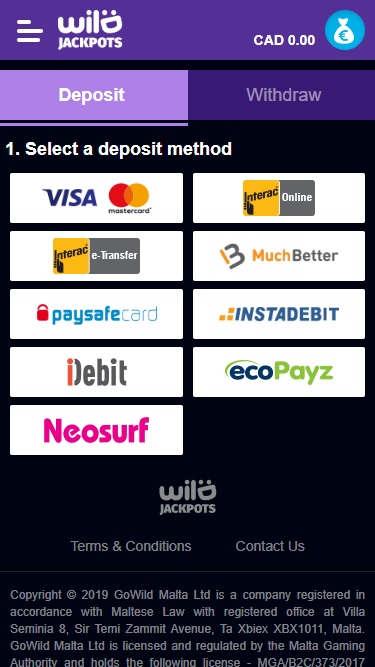 يتميز كازينو Wild Jackpots بتنوع نظامه المصرفي، حيث يُجري الكازينو معاملاته المالية عبر التحويل البنكي، وEntroPay، وiDeal، وSkrill، وMasterCard، وNeteller، وPaysafecard، وVisa، وMoneta.ru، وecoPayz، وGiroPay، وSOFORT Banking، وTrustly، وغيرها. يُحدد الكازينو مهلة انتظار للأرباح تصل إلى 48 ساعة، وحدًا أسبوعيًا للسحب بقيمة 10,000 دولار أمريكي.