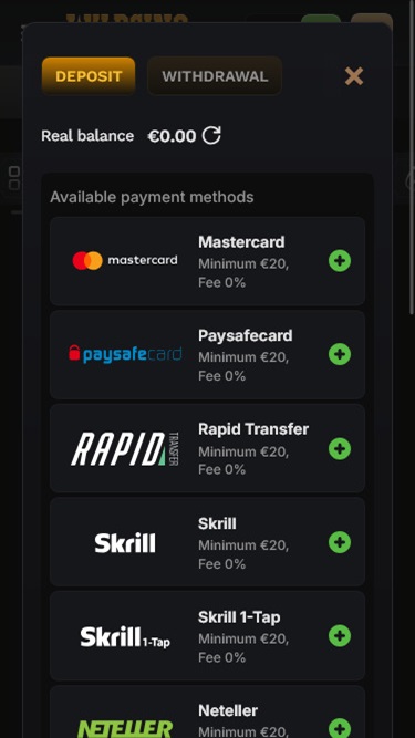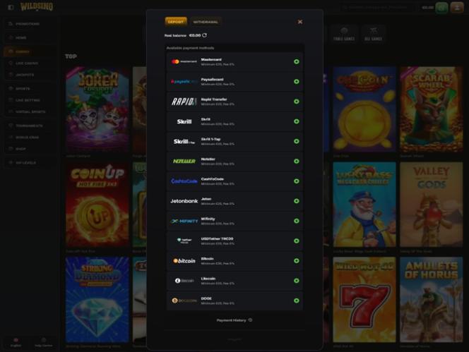 فيما يتعلق بطرق الدفع، تتيح العلامة التجارية للاعبين استخدام الخيارات التقليدية والحديثة للإيداع والسحب. تتوفر جميع طرق الدفع التقليدية مثل Visa و Mastercard و Skrill و Neteller و Jeton و MiFfinity والتحويل البنكي . كما يمكن للاعبين استخدام العملات المشفرة الحديثة مثل Bitcoin و Litecoin و Dogecoin و Tether كخيارات دفع صالحة.