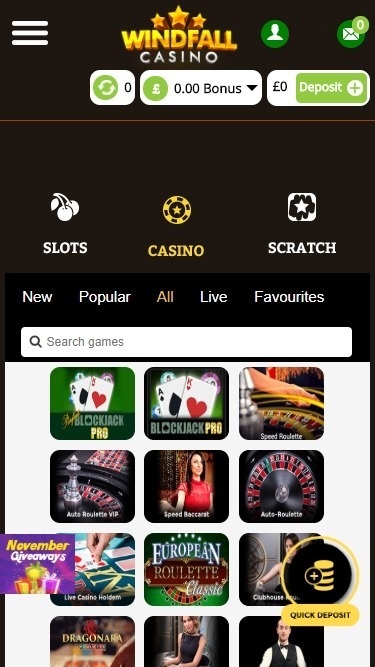 يقدم كازينو Windfall عددًا لا بأس به من ألعاب الفيديو وألعاب السلوتس الكلاسيكية، مع مجموعة متنوعة من السمات والميزات في مكتبة Cozy Games الخاصة. هناك العشرات من الألعاب التي يمكنك لعبها، وهي مناسبة تمامًا لشاشات الكمبيوتر والهواتف المحمولة. مع ذلك، من المؤسف عدم وجود جوائز كبرى تصاعدية هنا.