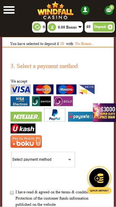 النظام المصرفي مُخيّب للآمال بعض الشيء، حيثُ يُقدّم كازينو Windfall حدًا منخفضًا للسحب الأسبوعي بقيمة 1500 جنيه إسترليني وشهريًا بقيمة 3000 جنيه إسترليني. ومما يزيد الأمر سوءًا أن الكازينو يستغرق ما بين 7 و10 أيام عمل لمعالجة المدفوعات. يقبل الكازينو الإيداع والسحب عبر بطاقات Maestro وMasterCard وNeteller وPaysafecard وVisa وBoku وSolo.