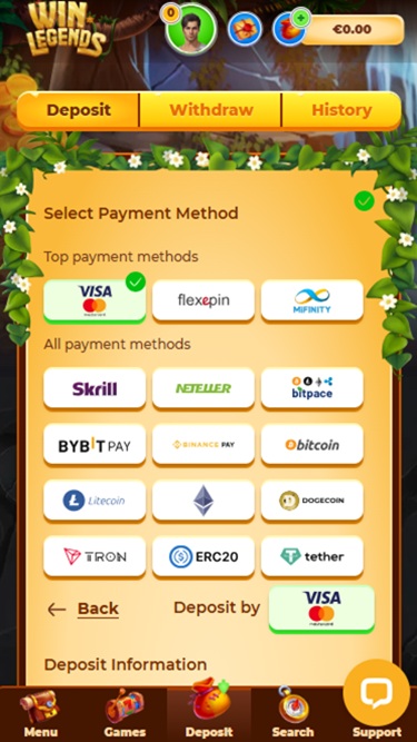 خيارات الخدمات المصرفية في WinLegends Casino