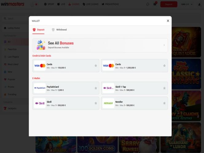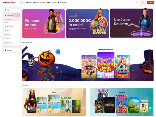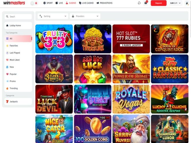 يتم تشغيل كازينو Winmasters بواسطة Microgaming, Net Entertainment, Playtech, 1x2gaming, Big Time Gaming, ELK Studios, Evolution Gaming, Ezugi, Genesis Gaming, iSoftBet, lightningboxgames, Play'n GO, playson, Relax Gaming, Thunderkick, Endorphina, Wazdan, Realistic Games, Betgames, Booming Games, Stakelogic, Pragmatic Play, Nolimit City, Felt Gaming, Red Tiger Gaming, Red Rake Gaming, Skillzzgaming, Fantasma Games, SYNOT Games, Kalamba, Revolver Gaming, Skywind, Spinmatic, Spadegaming, Triple Edge Studios, Northern Lights Gaming, Stormcraft Studios, Switch Studios, OneTouch, Electric Elephant Games, Pocket Games Soft, Dreamtech Gaming, All41 Studios, Gluck Games, Gameburger Studios, Pulse 8 Studios, Neon Valley Studios, Golden Rock Studios, Spearhead Studios, Swintt, SpinPlay Games, HungryBear Gaming, Real Dealer Studios, GONG Gaming, Blue Guru Games, Lady Luck Games, Buck Stakes Entertainment, Games Global, Amusnet Interactive, Wizard Games, 2by2 Gaming, Ash Gaming, Blueprint Gaming, CT Interactive, Leander Games, Merkur Gaming, Pariplay, Push Gaming, Tom Horn Gaming, Reel Time Gaming, Authentic Gaming, BF Games, Bally Wulff, Iron Dog Studio, Old Skool Studios, Foxium, Just For The Win, Storm Gaming Technology, PearFiction Studios, Wild Streak Gaming, Slingshot Studios, Fortune Factory Studios, Jade Rabbit Gaming, STHLM Gaming, 4ThePlayer, Gamevy, Crazy Tooth Studio, ReelPlay, Zonelock, Alchemy Gaming, Rarestone Gaming, Plank Gaming, Black Pudding Games, Snowborn Games, Hacksaw Gaming, Max Win Gaming, Gold Coin Studios, Half Pixel Studios, SilverBack Gaming, Aurum Signature Studios, Armadillo Studios, FlipLuck, Area Vegas, Leap Gaming, GoldenRace, Kiron, Wishbone Games, LiveG24, Print Studios, HammerTime Games, Four Leaf Gaming, INO Games, Nailed It! Games, Live 5, Neko Games, Reel Kingdom, Oros Gaming and JVL ، ويتم توفير ألعاب الكازينو الخاصة به من خلال منصة تعتمد على الويب بالإضافة إلى موقع محمول.
