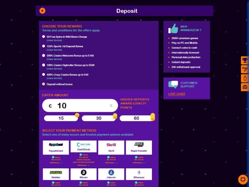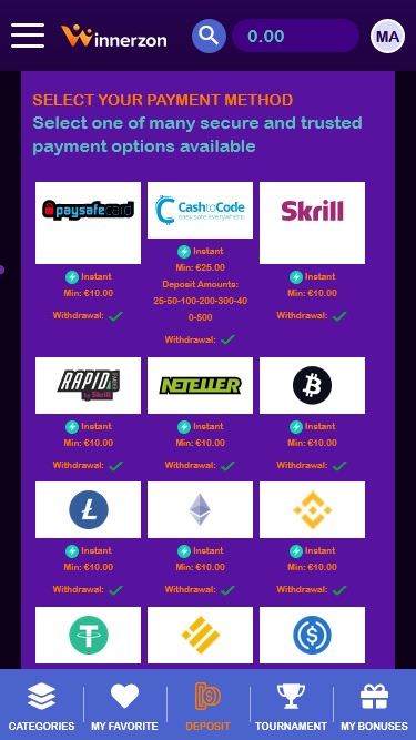 خيارات الإيداع عاملٌ آخر يجب مراعاته عند اختيار كازينو إلكتروني للعب فيه. في كازينو WinnerzOn، يمكنك الدفع باستخدام خيارات شائعة مثل Visa وMasterCard وNeteller وSkrill وPaysafecard وغيرها الكثير. كما يضمن المشغلون إمكانية إيداع اللاعبين باستخدام Bitcoin والعملات المشفرة الأخرى.