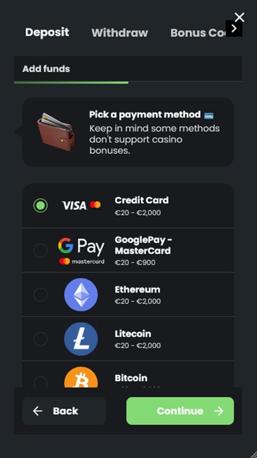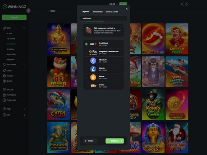 يقدم كازينو Winningz طرق دفع متنوعة مثل التحويل البنكي، وGoogle Pay، وVisa و MasterCard على سبيل المثال لا الحصر، بالإضافة إلى خيارات التشفير مثل Bitcoin، وBitcoin Cash، وCardano، وDogecoin، وEthereum، وLitecoin، وRipple، وSolana، وTether، وTron، وUSD Coin.